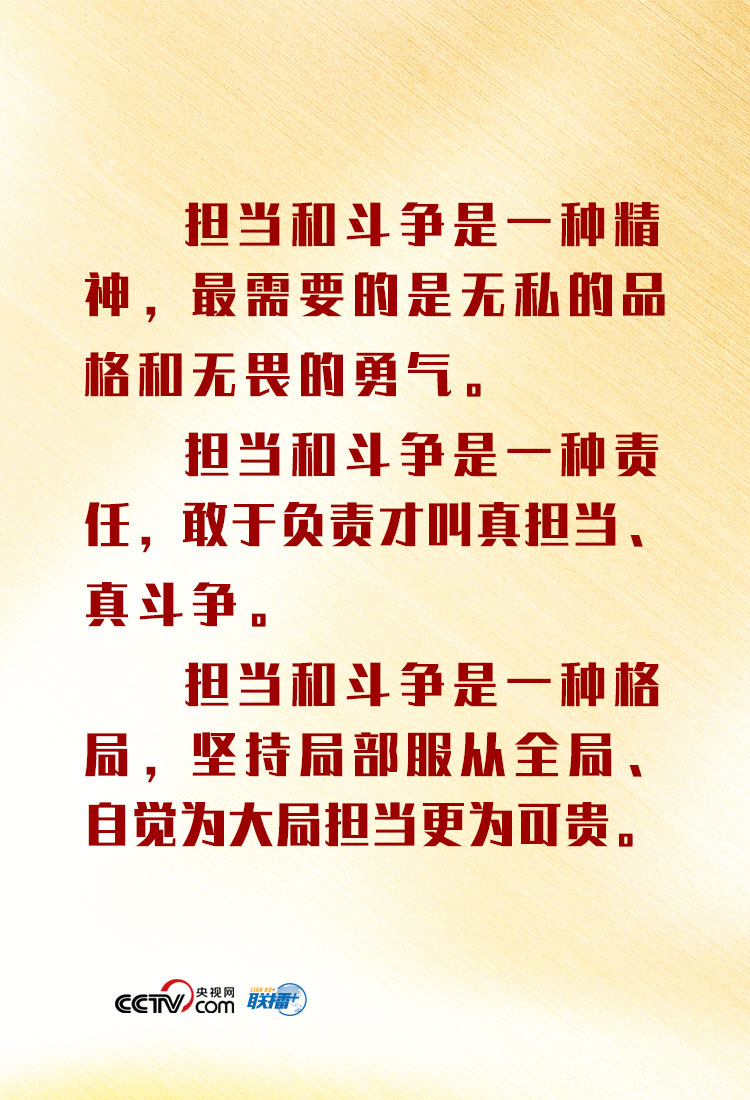 总书记在讲话中勉励年轻干部要发扬担当和斗争精神。这些年,正是因为有了这样的思想准备,我们才能从容应对一系列风险考验。无数事实告诉我们,唯有以狭路相逢勇者胜的气概,敢于斗争、善于斗争,我们才能赢得尊严、赢得主动,切实维护国家主权、安全、发展利益。