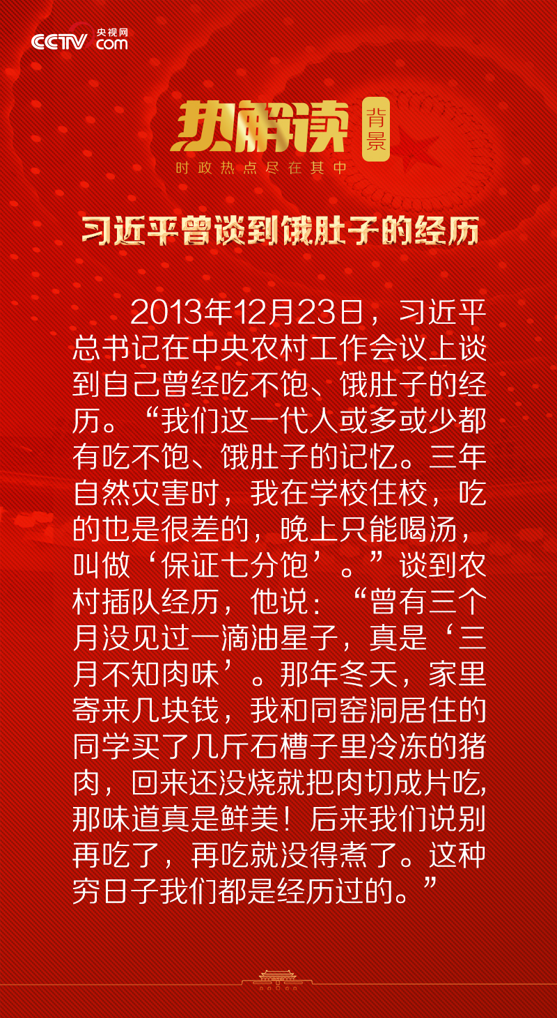 在本次联组会上,总书记忆苦思甜,动情回忆以往勒紧裤腰带的苦日子。这不是总书记第一次回忆“饿肚子”的苦日子,强调粮食安全的重要性。