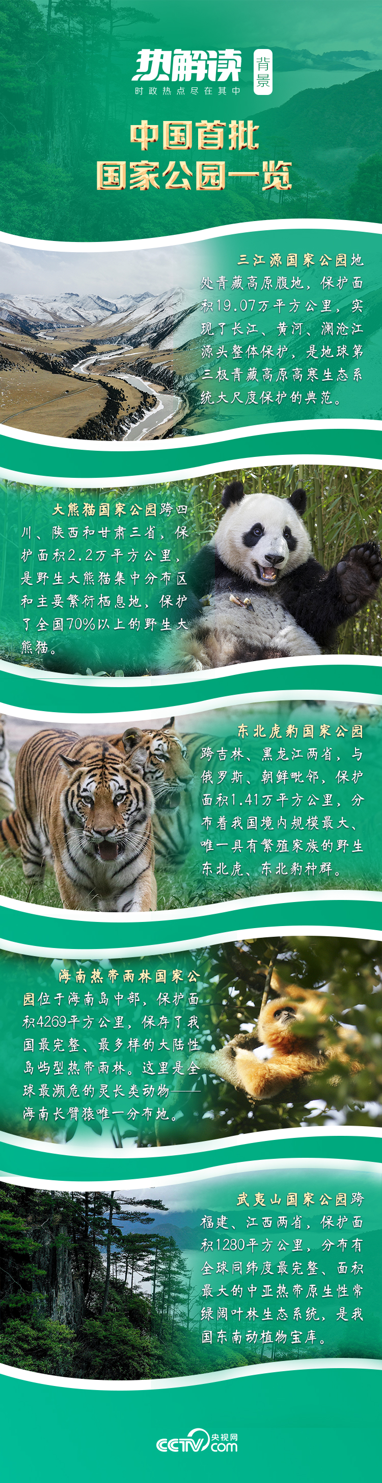 “中华水塔”三江源、竹林幽幽的熊猫乐园、东北原始森林的虎豹天堂、海南岛的热带雨林、碧水丹霞的武夷山……首批设立的5个国家公园保护面积超过23万平方公里,涵盖近30%的陆域国家重点保护野生动植物种类。