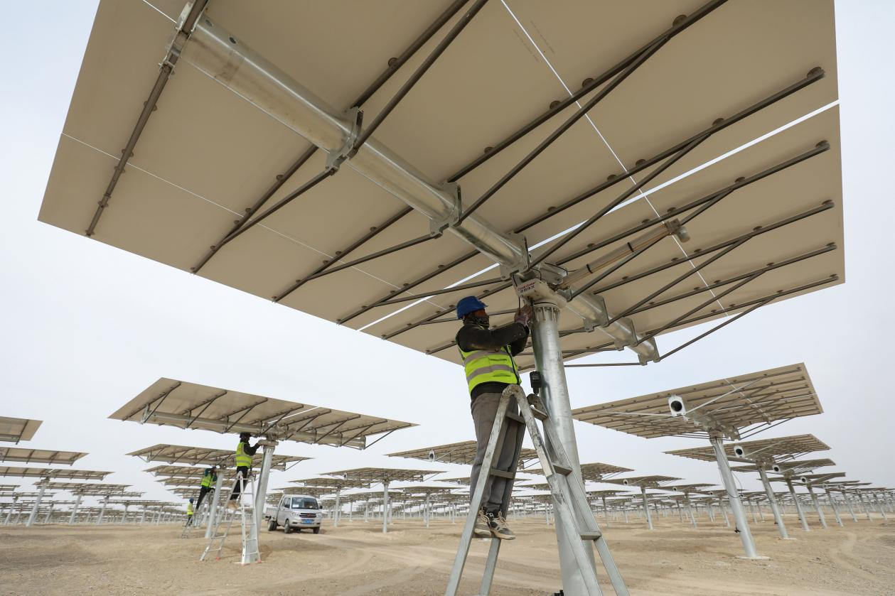 2024年3月12日,甘肃省酒泉市金塔中光太阳能10万千瓦光热+60万千瓦光伏项目现场,施工人员有序作业。