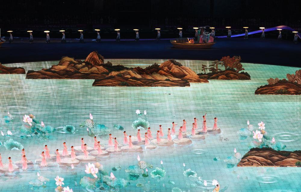 2023年9月23日,演员在杭州亚运会开幕式上表演。《千里江山图》和《富春山居图》两幅国宝级名画,通过数字技术,成为移动的山水。