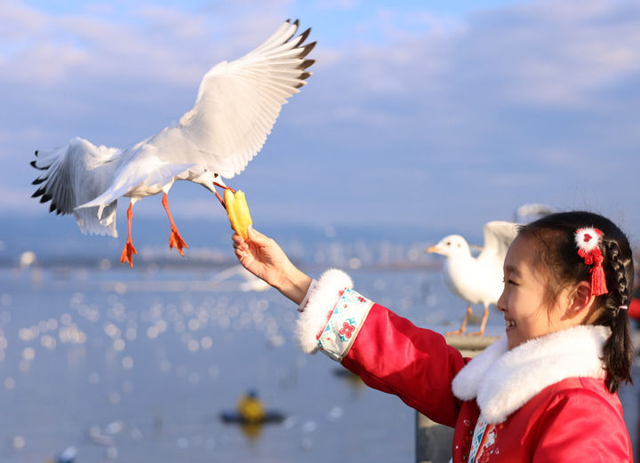 2024年1月17日,在云南省昆明市,游客在滇池边喂红嘴鸥。 新华社发(刘元嵩 摄)