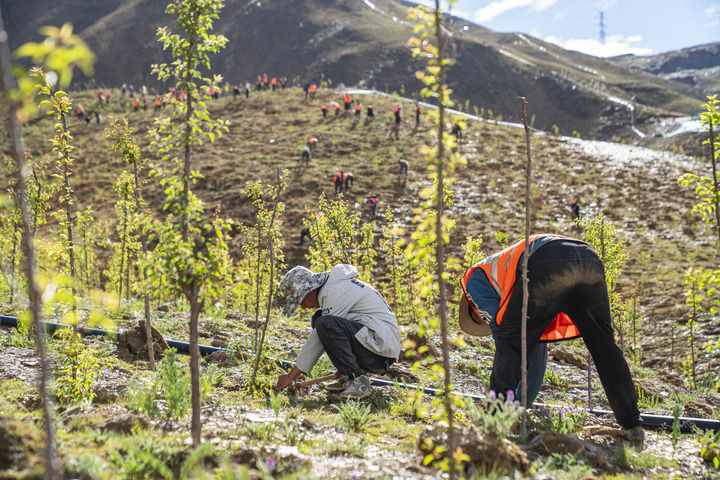 2023年6月18日,工人在西藏拉萨市城关区次角林村附近的山上播种造林。新华社记者 孙非 摄