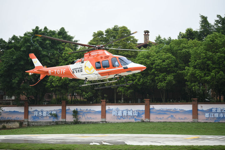 2024年6月20日,一架阿古斯塔AW109型载人直升机经过两次成都市域内的往返飞行,完成成都市城市低空载人出行验证飞行任务,探索成都低空经济的应用场景。这是在四川省成都市都江堰市青城山起降点拍摄的参与验证飞行的载人直升机。新华社记者 胥冰洁 摄
