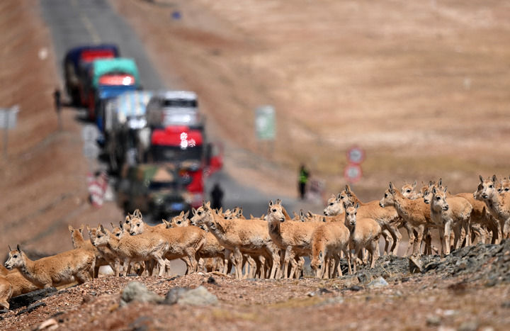 2023年5月29日,一群待产雌性藏羚羊在通过青藏公路前往可可西里卓乃湖产仔。新华社记者 张宏祥 摄