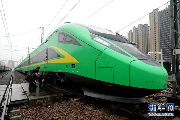 日前,被昵称为“绿巨人”的新型时速160公里动力集中动车组——CR200J型“复兴号”列车正在中国铁路上海局集团有限公司上海车辆段进行运行前的静态和动态检测。据悉,该型号动车组将在2019年春运前夕上线运行,同高铁形成优势互补,为旅客提供差异化服务。 新华社记者 陈飞 摄