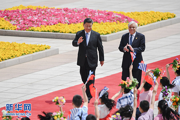 5月14日,国家主席习近平在北京人民大会堂同希腊总统帕夫洛普洛斯举行会谈。这是会谈前,习近平在人民大会堂东门外广场为帕夫洛普洛斯举行欢迎仪式。 新华社记者 张领 摄