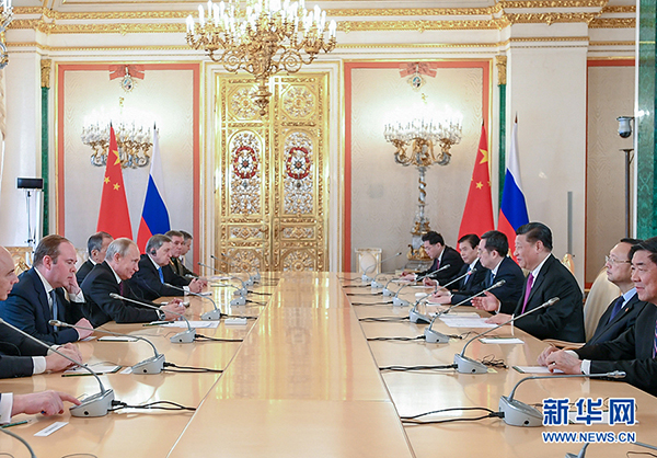 新华社莫斯科6月5日电(记者范伟国 霍小光 刘畅)国家主席习近平5日在莫斯科克里姆林宫同俄罗斯总统普京会谈。两国元首高度评价建交70年来双边关系发展,一致同意秉持睦邻友好、合作共赢理念,发展中俄新时代全面战略协作伙伴关系,将两国关系提升到更高水平,更好惠及两国人民和世界人民。