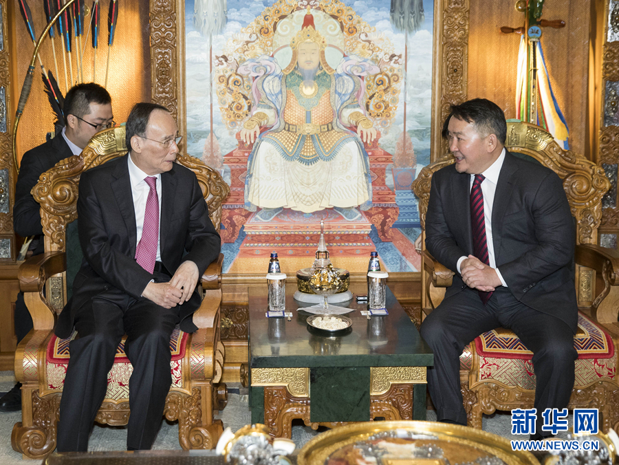 新华社乌兰巴托7月12日电(记者刘畅 阿斯钢 谢荣)应蒙古国总理呼日勒苏赫邀请,国家副主席王岐山7月10日至12日访问蒙古国,在乌兰巴托先后会见呼日勒苏赫总理、赞登沙特尔国家大呼拉尔主席和巴特图勒嘎总统,并出席中蒙建交70周年纪念活动。