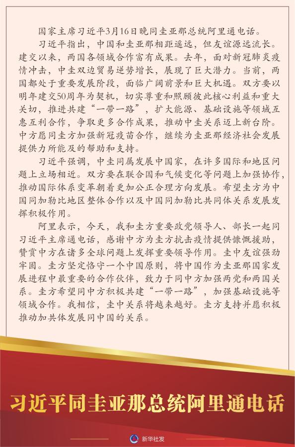 新华社北京3月16日电 国家主席习近平3月16日晚同圭亚那总统阿里通电话。