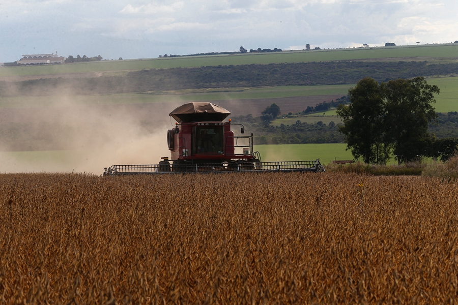 4月12日,在巴西戈亚斯州班德里尼亚农场,农机进行收获大豆作业。新华社发(卢西奥·塔沃拉摄)