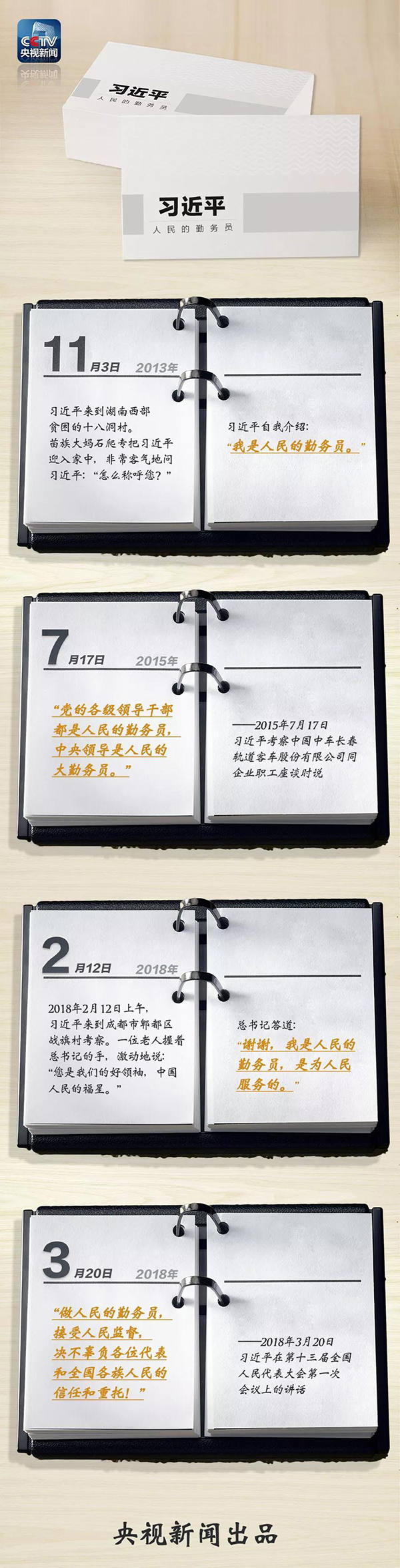 2013年11月,习近平总书记来到湖南湘西十八洞村,当不识字也不会说“官话”的苗族大妈石爬专问他怎么称呼时,他如此回答。这几年里,习近平在很多场合都强调自己是“人民的勤务员”,中央领导是人民的大勤务员。为民服务的爱民情怀,溢于言表。