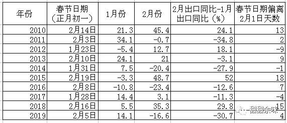 海关总署2010-2019年前2个月的出口数据,正好可以印证这一规律(见下表)。