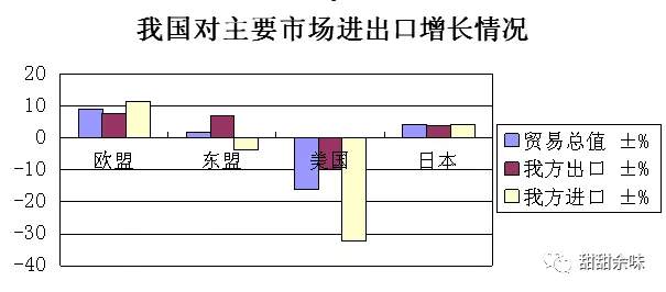 从海关总署数据来看,几个主要市场,除了中美贸易总值降幅明显,与欧盟、东盟、日本总体都有回升,与欧盟及东盟的贸易总值分别占到我外贸总值的16.2%、12.8%,都超过了中美贸易总值的占比11.6%。