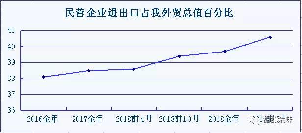 2018年全年,我国民营企业进出口12.1万亿元,增长12.9%,占我国进出口总值的39.7%,比2017年提升1.1个百分点。