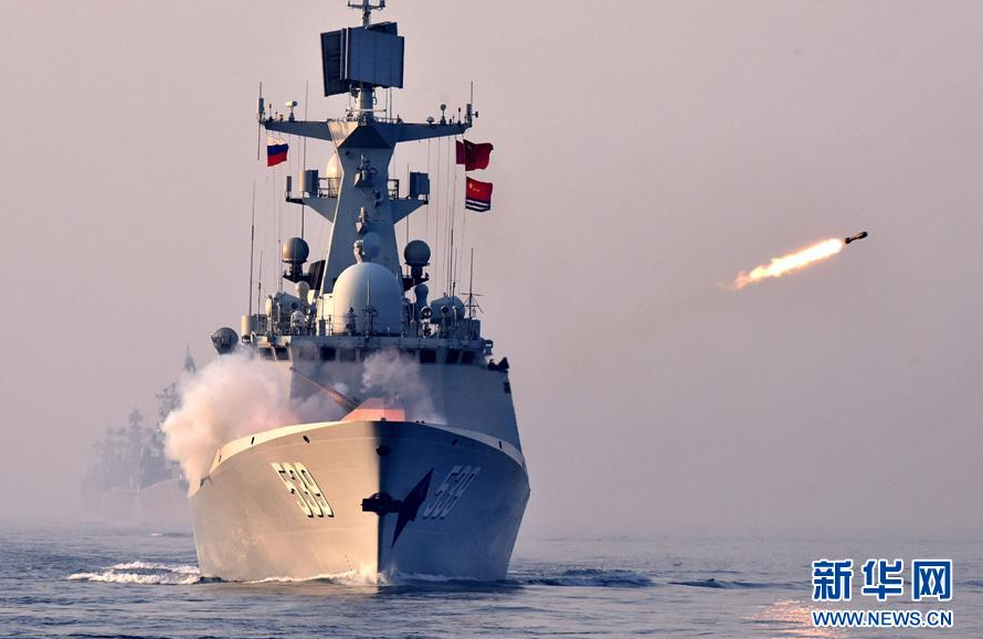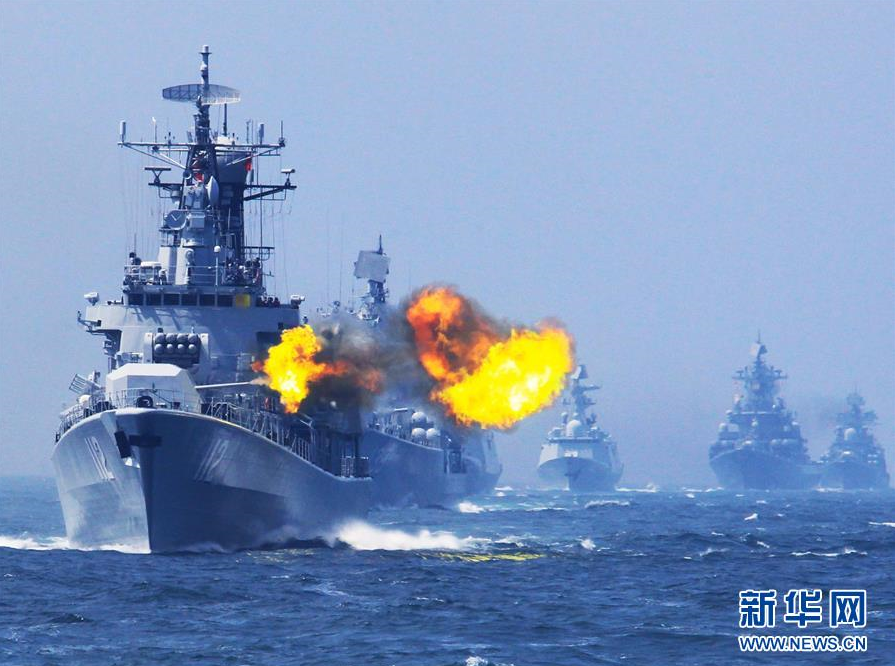 在中俄“海上联合—2014”军事演习实兵演练中,中国海军导弹驱逐舰哈尔滨舰主炮对海上目标进行射击(2014年5月24日摄)。 新华社记者 査春明 摄