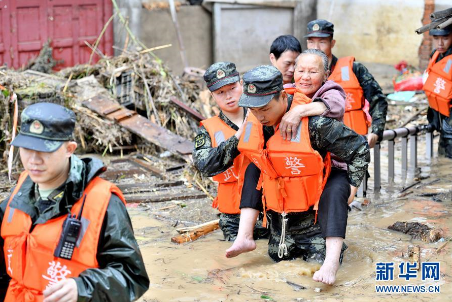 武警福建总队三明支队官兵在永安市小陶镇老街转移被困群众(5月17日摄)。 新华社发(李涛 摄)