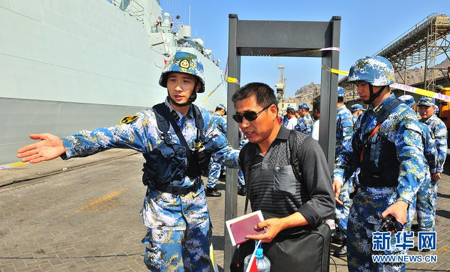 中国海军第十九批护航编队临沂舰抵达也门亚丁港,帮助准备撤离的中国同胞进行安全检查(2015年3月29日摄)。 新华社发(熊利兵 摄)