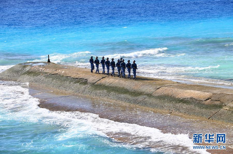 守卫在南沙群岛永暑礁上的海军官兵在防波堤上巡逻(2016年1月5日摄)。 新华社记者 查春明 摄