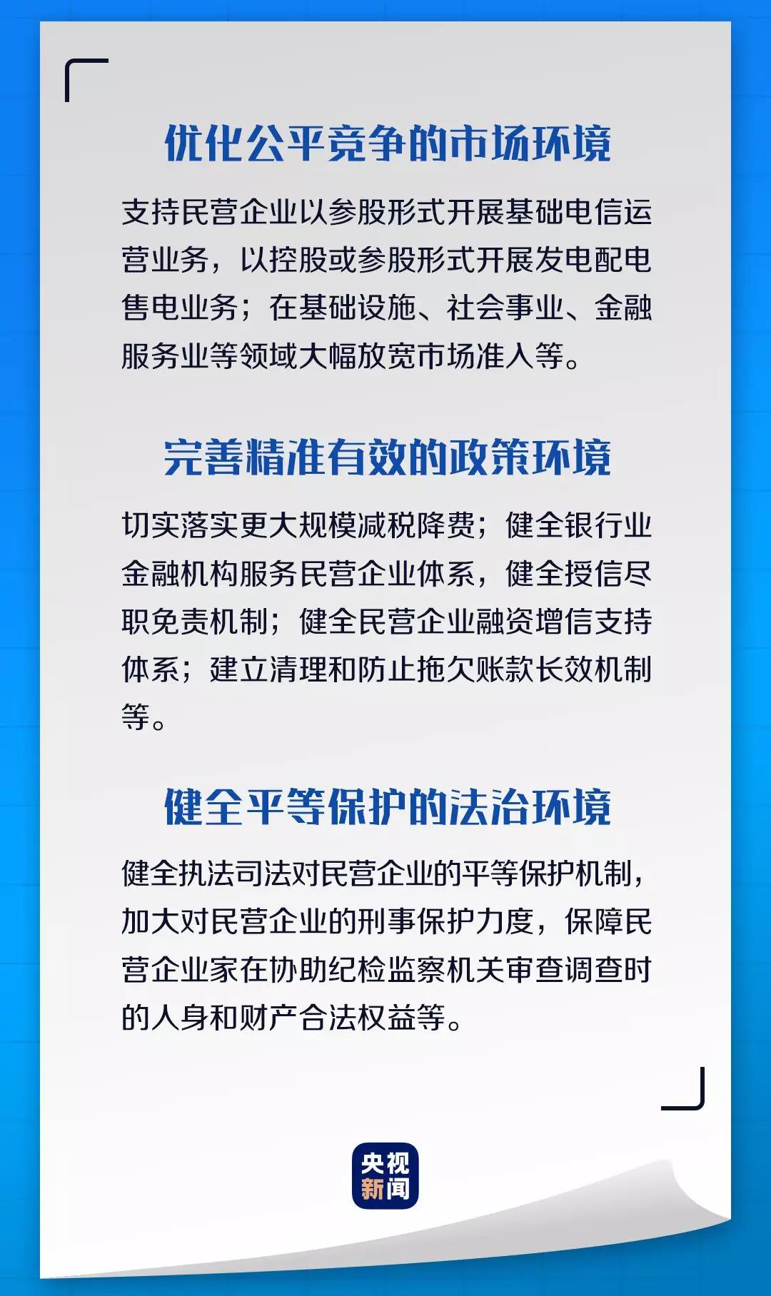 近日公布的《中共中央 国务院关于营造更好发展环境支持民营企业改革发展的意见》,进一步在优化公平竞争的市场环境、完善精准有效的政策环境、健全平等保护的法治环境等方面作出具体安排。