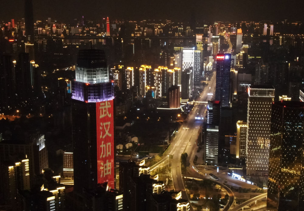 2月8日,武汉一高层建筑的景观灯打出“武汉加油”的字样。新华社记者程敏摄