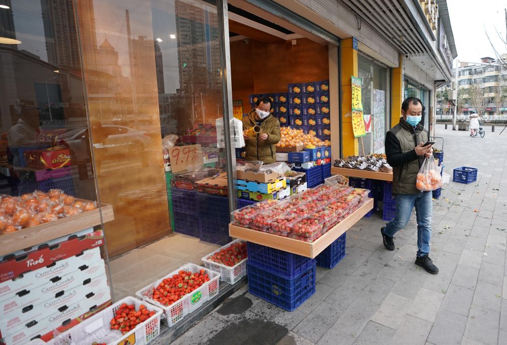 2月8日,武汉榴恋悠悠水果店利用元宵节之际搞起了促销。这是一位顾客从店里买完水果后离开。新华社记者王毓国摄