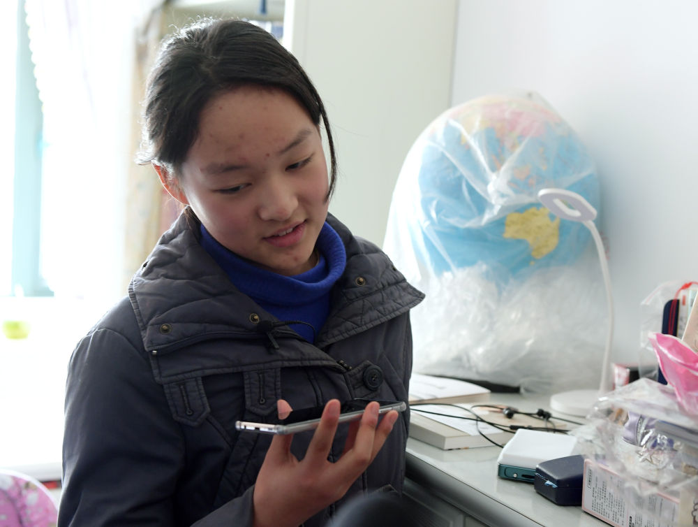 孙婉清在家中使用手机和父亲通话(1月29日摄)。新华社记者 李贺 摄