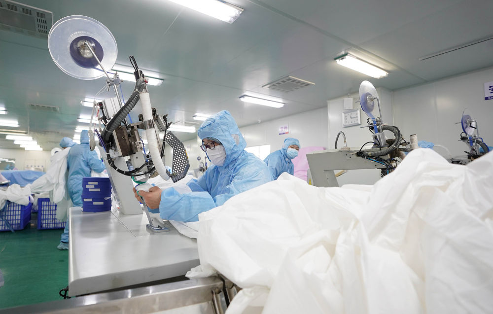 ↑ 1月28日,在武汉市新洲区武汉协卓卫生用品有限公司,工人在赶制防护服。