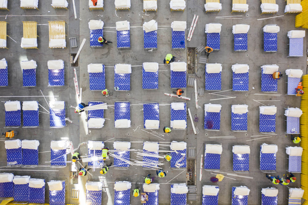 ↑ 2月4日,改造中的武汉客厅内部,它将被改造成为一所“方舱医院”,以收治新型冠状病毒感染的肺炎轻症患者为主。