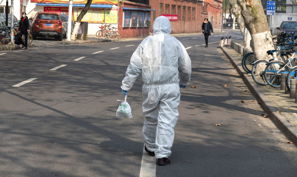 在武汉市江岸区永清街道吉林社区采访时,我遇到了社区的工作人员张敏,她负责给社区里隔离的老人病患送药、送菜、送食品。她穿着防护服,戴着防护眼镜。