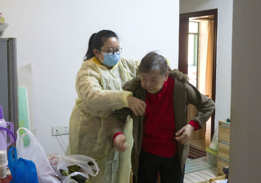 ↑ 2月5日,武汉市江岸区永清街道吉林社区工作人员张敏为老伴住院的独居老人送药。