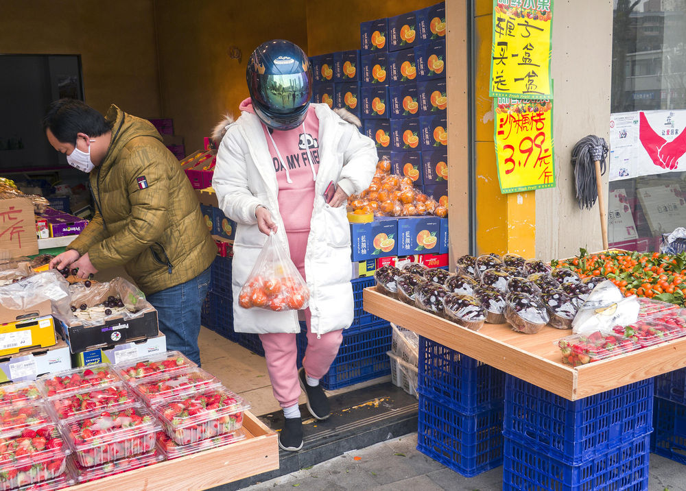 ↑ 2月8日,在武汉市江汉区,一名女子外面戴着摩托车头盔,里面戴着口罩在水果店采购。