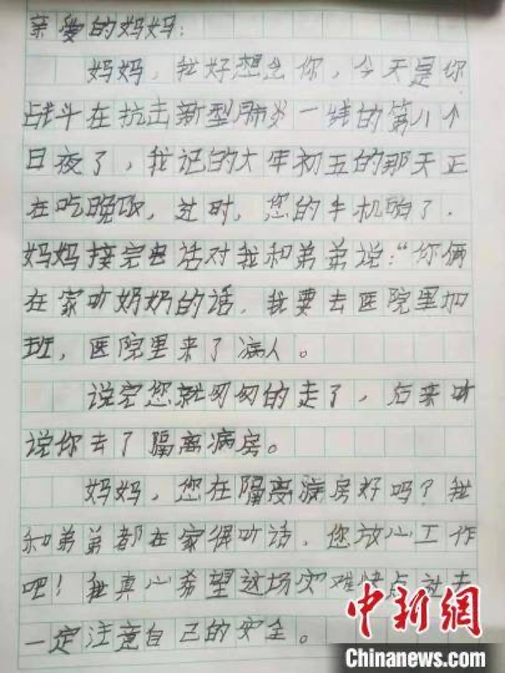 孩子在信中写道:“妈妈,我好想念你,今天是您战斗在抗击新型肺炎一线的第八个日夜了……妈妈,你是我崇拜的英雄。”