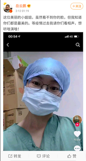 这两天,相声演员岳云鹏发的微博火了。原来是前线的一位护士在社交媒体平台发文称,等疫情结束想去德云社看演出。岳云鹏看到后在微博暖心回复称:这位美丽的小姐姐,虽然看不到你的脸,但我知道你们都是最美的。等疫情过去我请你们看相声,想听啥演啥!
