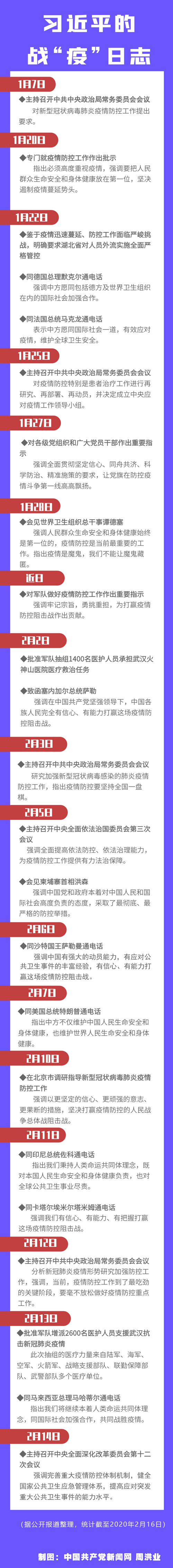编者按:新冠肺炎疫情发生以来,党中央高度重视,习近平总书记亲自部署、亲自指挥,多次召开会议、听取汇报、作出重要指示,要求各级党委和政府及有关部门制定周密方案,组织各方力量开展防控。新时代学习工作室为您梳理出习近平总书记的战“疫”日志。