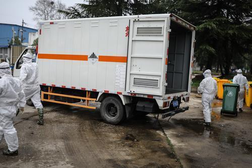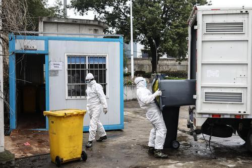 2月26日,湖北省武汉市,几名医疗废物处理员在搬运医疗垃圾。中青报·中青网记者 赵迪/摄
