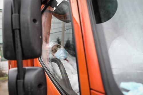 2月26日,湖北省武汉市,准备进入医疗垃圾焚烧场时,正在等待的医疗垃圾搬运员。中青报·中青网记者 赵迪/摄