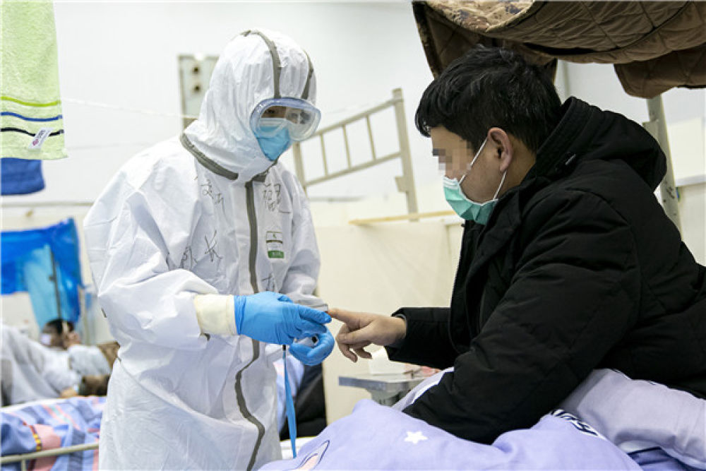 2月22日,在武汉市第一医院重症监护室,来自江苏医疗队1991年出生的李响在进行化验工作。新华社记者 肖艺九 摄
