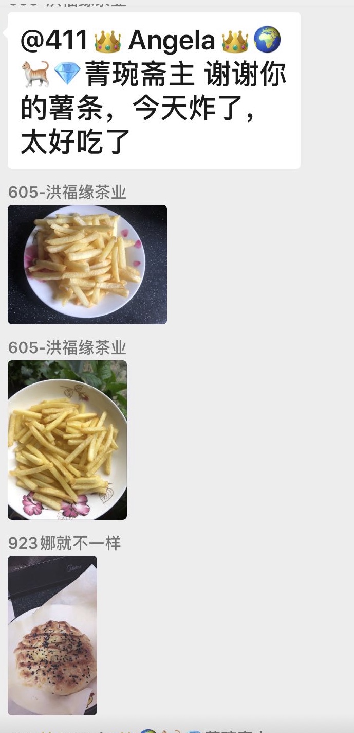 还有不少住户在得到邻居赠送的蔬菜后,会发布“买家秀”来展示做菜成果。群内605的住户在群里发了好几张炸得金黄的薯条图片后,还@了411的住户说:“谢谢你的土豆,今天炸了,太好吃了!”411的住户立刻回复道:“你有番茄酱或者梅花盐的话,就着薯条味道更好!”