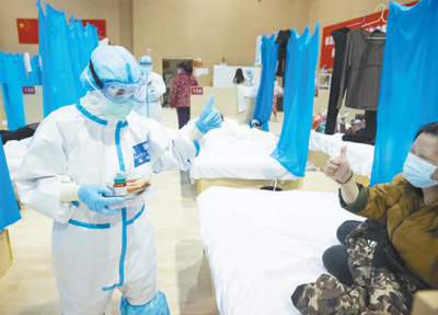 医护人员在照护患者身体疾病的同时,注意做好心理安抚工作。图为在武汉江夏方舱医院,湖南中医药大学第一附属医院护士长涂丽(前左)与一名患者交流。