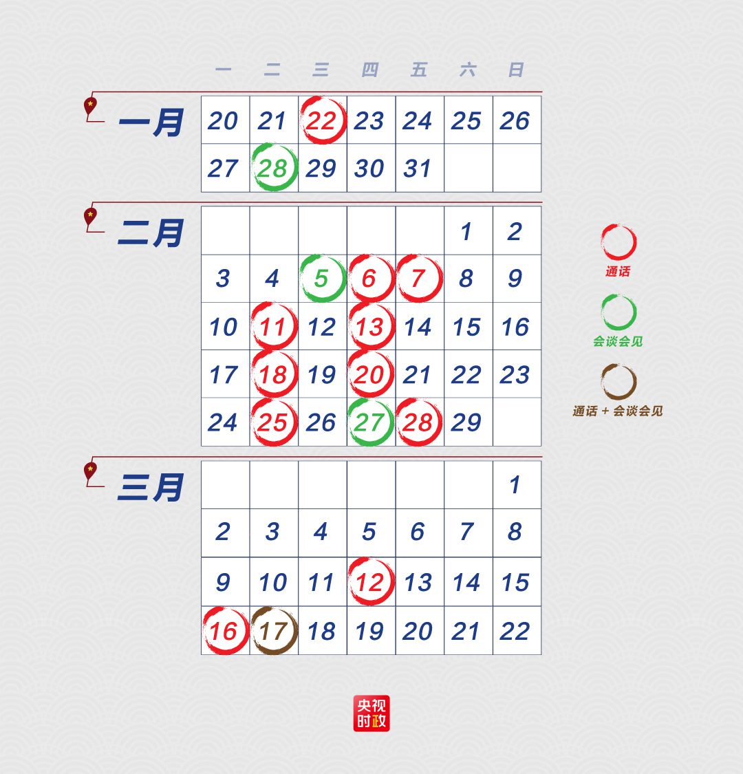 1月22日,习近平主席在应约与法国总统马克龙、德国总理默克尔通电话时,就谈到了新冠肺炎疫情。习主席表示,中方愿同国际社会加强合作,有效应对疫情,维护全球卫生安全。截至3月17日的18次通电话,涉及亚洲、欧洲、非洲、北美洲、南美洲的16个国家领导人和联合国秘书长。其中与法国总统马克龙先后通了两次电话。