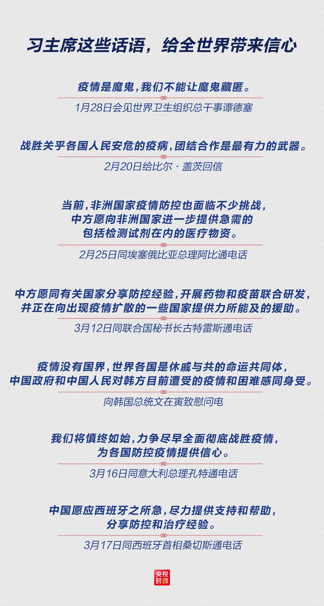 3月17日晚,习主席在应约同西班牙首相桑切斯通电话时说:“阳光总在风雨后。”