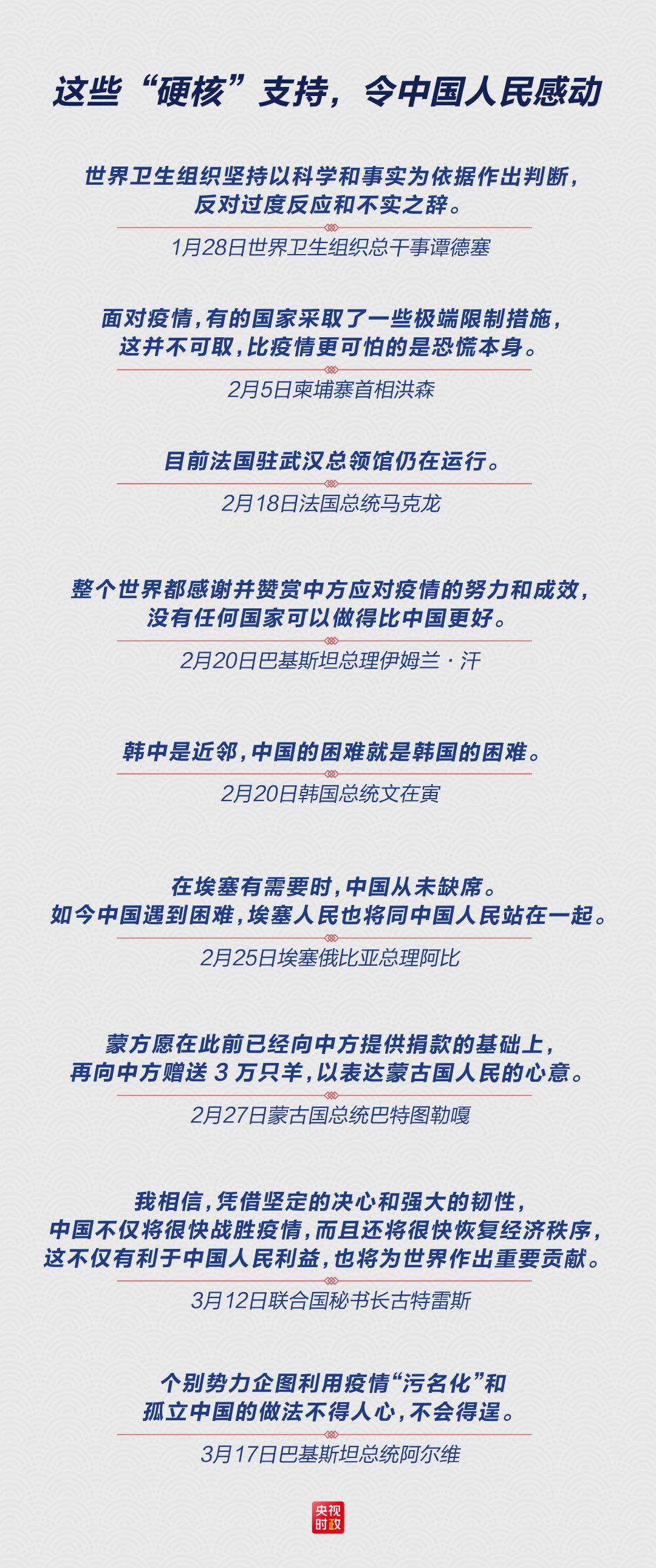 习主席说,人类是一个命运共同体,唯有团结协作才能应对各种全球性风险挑战。疫情发生以来,中国人民在疫情防控中展现的中国力量、中国精神、中国效率,展现的负责任大国形象,得到国际社会高度赞誉,中国也得到国际社会的宝贵支持。作为同壕战“疫”的战友,许多外方领导人向习主席表达“硬核”支持。