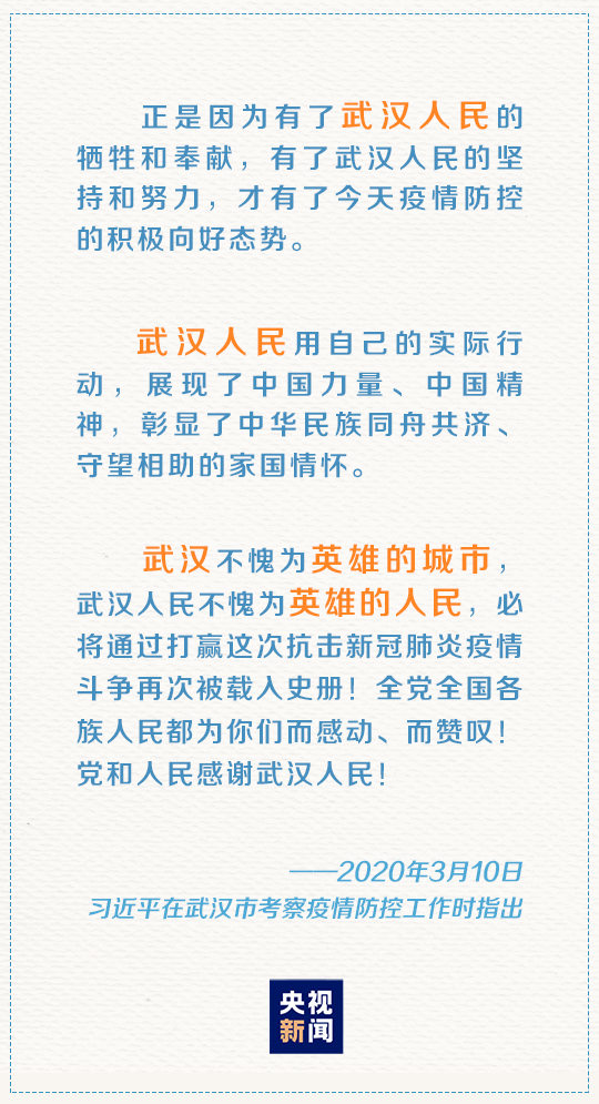 习近平总书记说:“在这次抗击疫情斗争中,武汉人民展现出了不怕牺牲的精神、勇于担当的精神、顾全大局的精神,还有甘于奉献的精神。这些精神都是中华民族的精神的重要体现。”