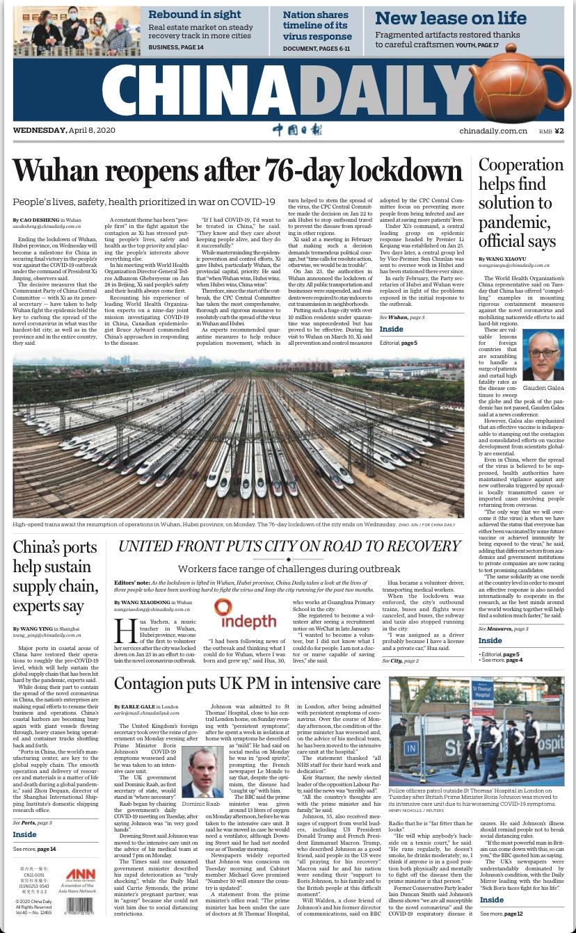 中国日报4月8日在头版刊发消息《Wuhan reopens after 76-day lockdown》