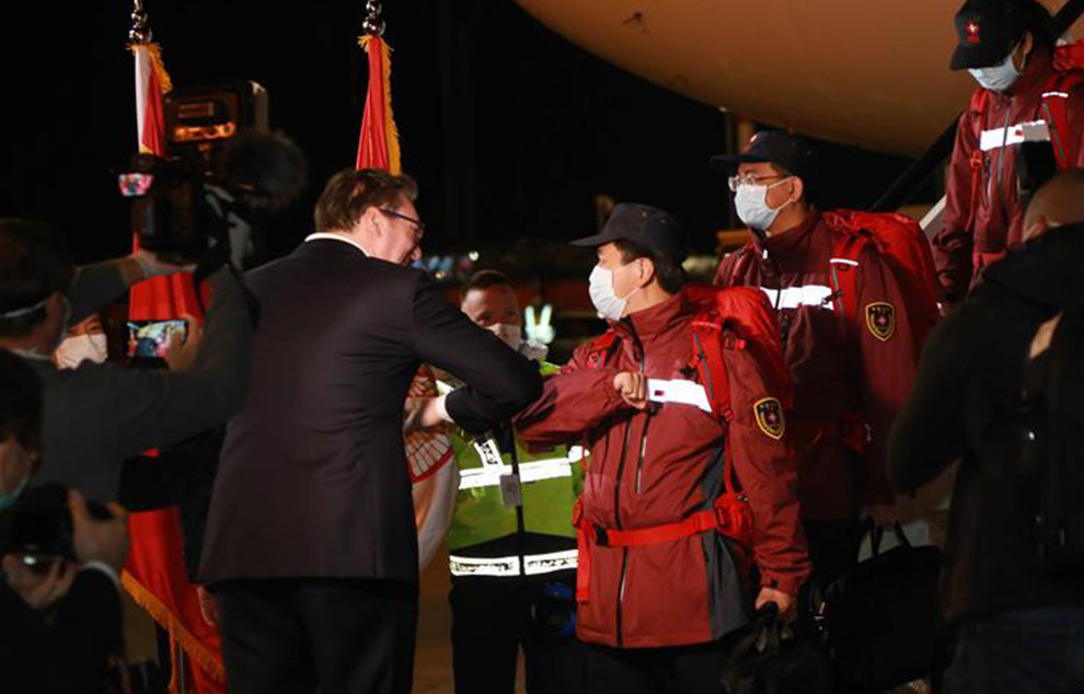 3月21日,在塞尔维亚首都贝尔格莱德,前来迎接的塞尔维亚总统武契奇(左)与中国援助塞尔维亚抗疫医疗专家组成员“碰肘”致意。
