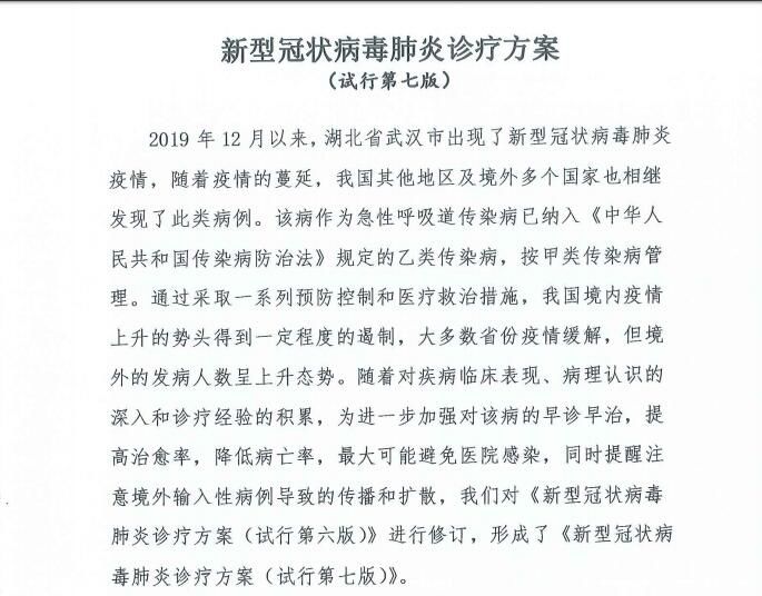 图为卫健委网站发布的第7版《新型冠状病毒肺炎诊疗方案》
