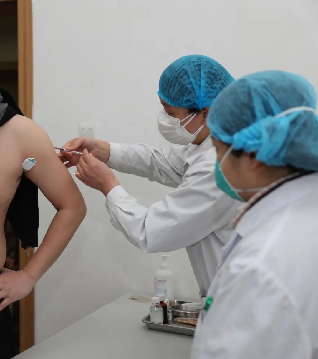 北京时间3月16日,陈薇团队研发的重组新冠疫苗获批进入临床。图为当天临床人体接种现场(来自军事科学院官方公众号)