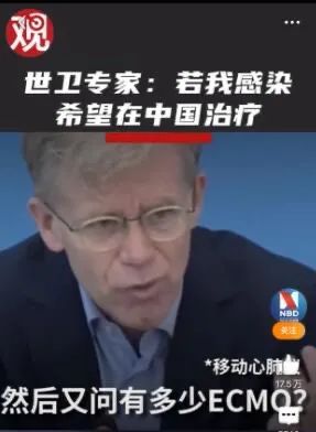 ECMO俗称人工心肺机,是一种用于协助重症心肺衰竭患者进行体外呼吸循环的急救设备。其核心部分是膜肺和血泵,通过把患者静脉血引出体外进行氧合,再将氧合后的血液输回体内,用于供氧,暂时替代心肺功能。图为世卫组织总干事高级顾问艾尔沃德在谈到ECMO时对中国的评价。
