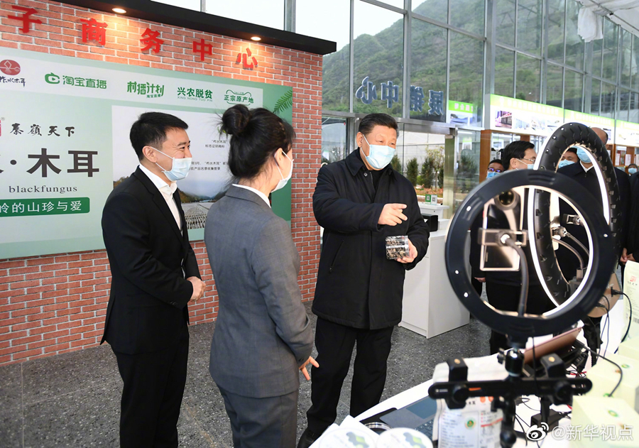 20日下午,柞水县小岭镇金米村培训中心,几位村民正在做网上直播卖货的准备工作,总书记走到直播平台前,同他们亲切交谈。